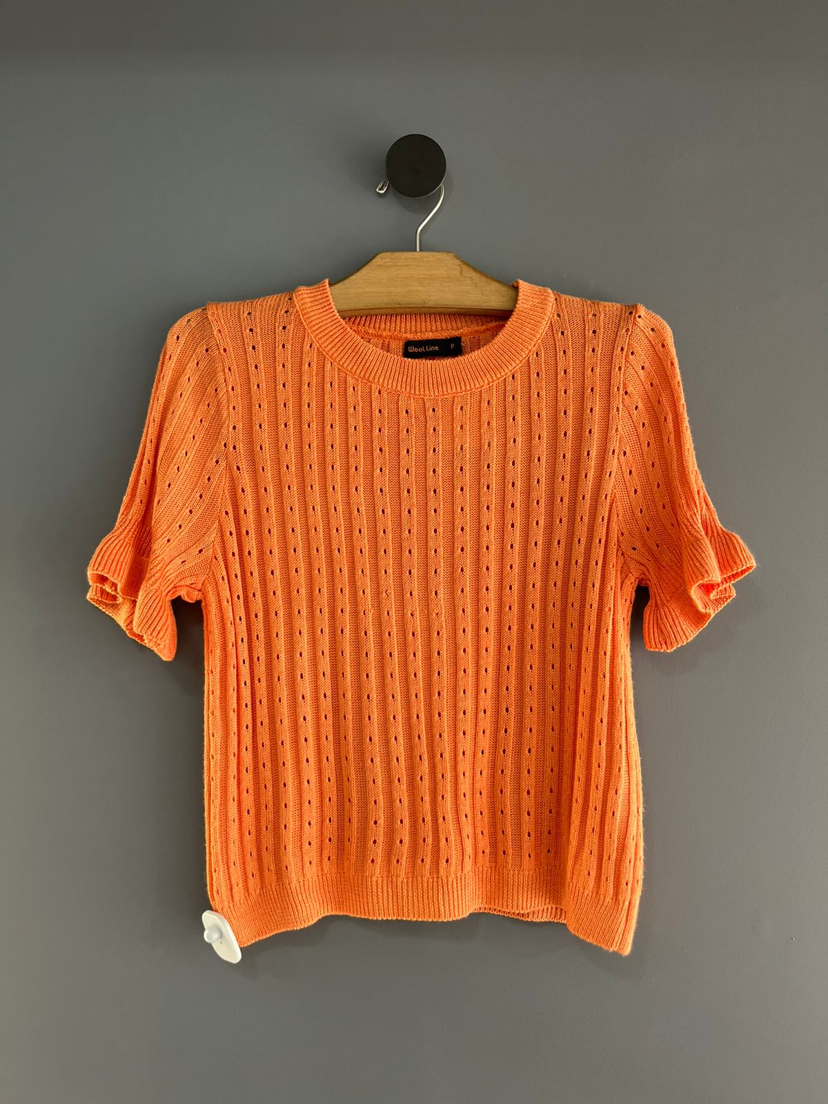 Blusa Woolline em tricô laranja coral, manga rodada e curta.
