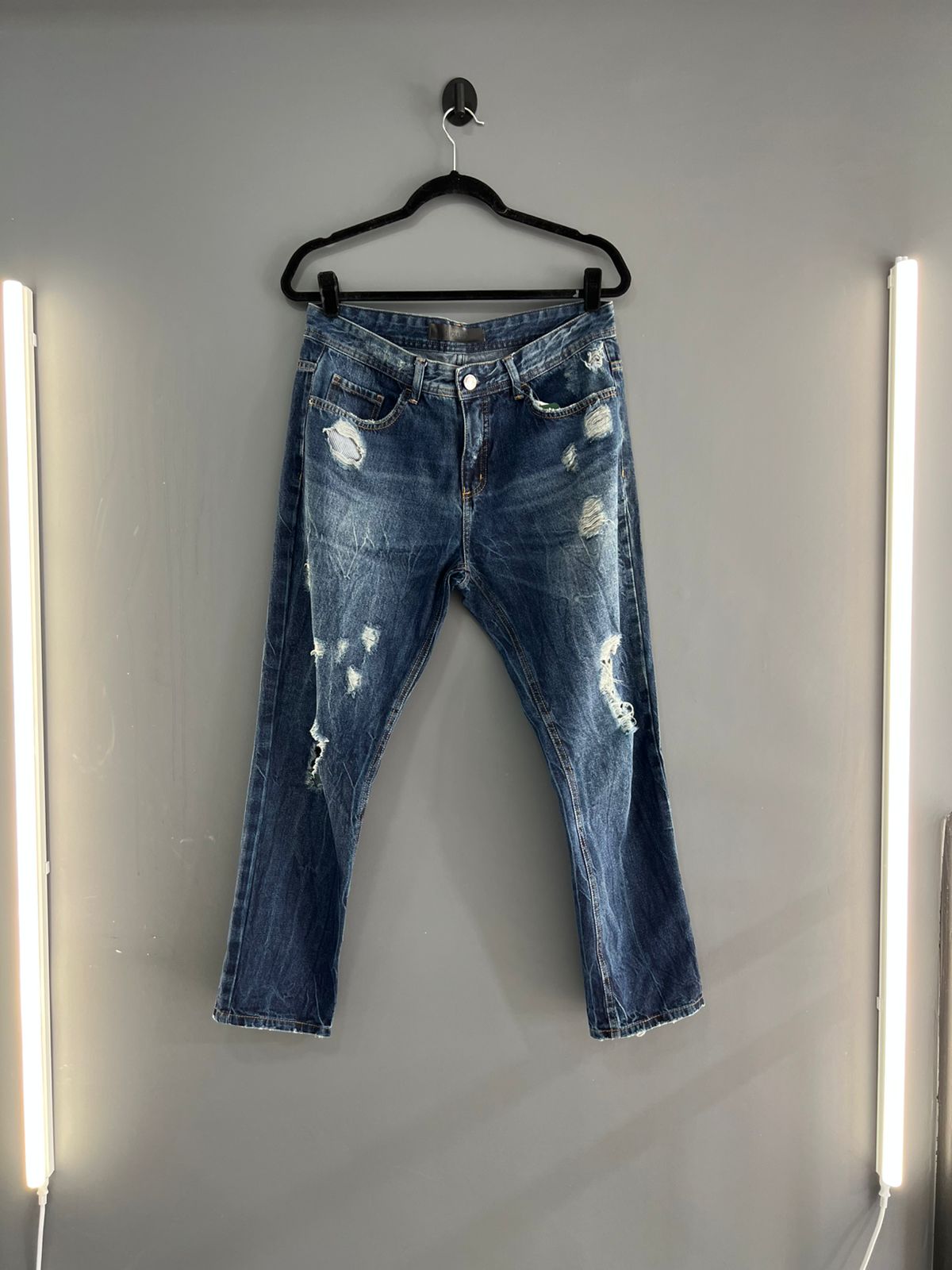 Calça jeans escuro boyfriend com puídos e detoonados.