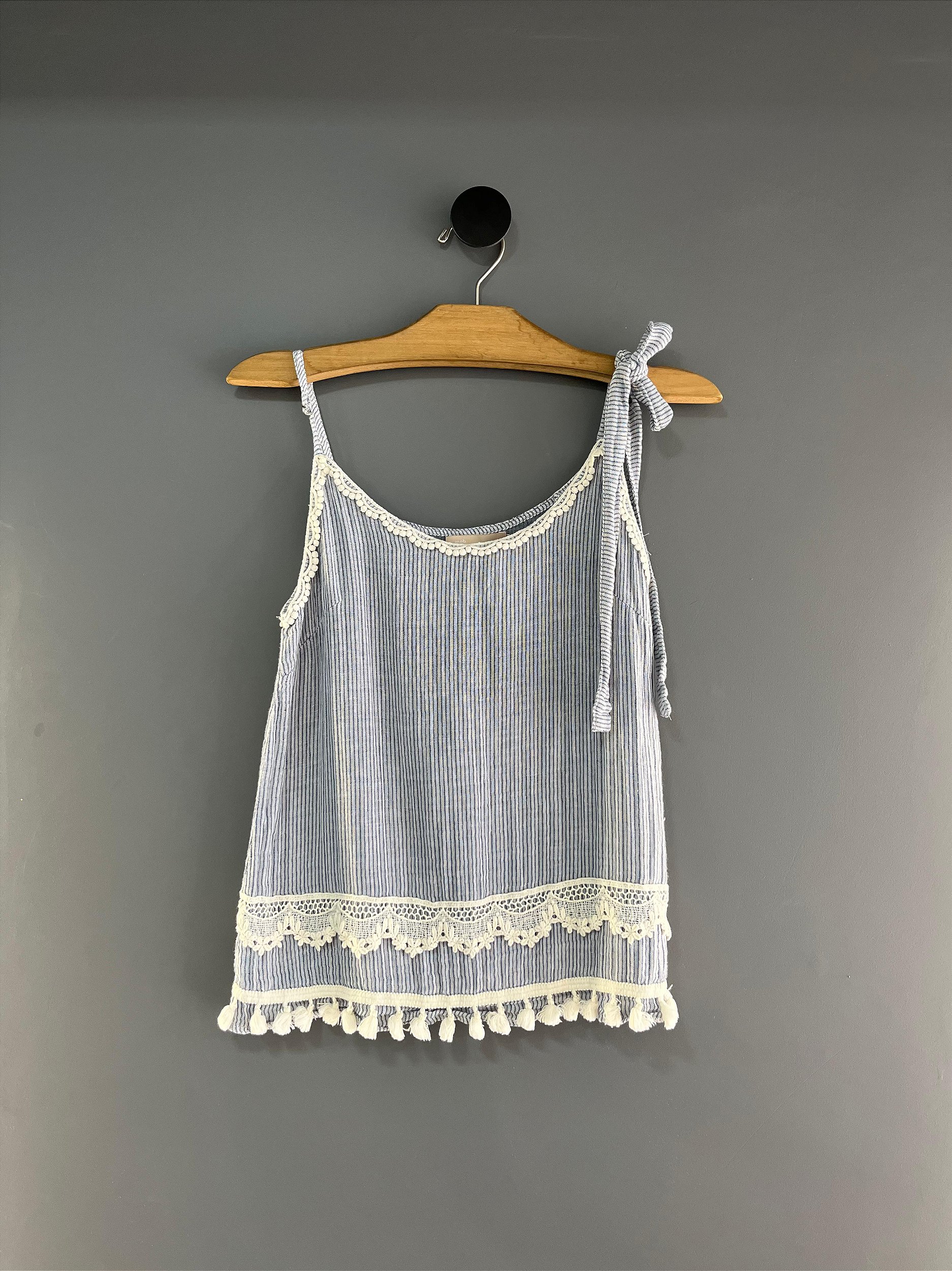 Regata da Mob, listrada em dois tons de azul, com uma alça ajustável e outra amarrável, detalhes em renda e barra com tassel.